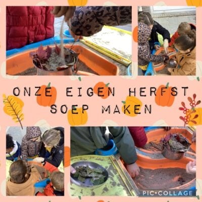 The Tulips make a delicious autumn soup outside in the feeling table. First we looked for leaves, twigs, acorns and lots of sand. When we have everything together, we get a pan and a delicious autumn soup is made! Add a bit of salt and pepper and enjoy! To the table!